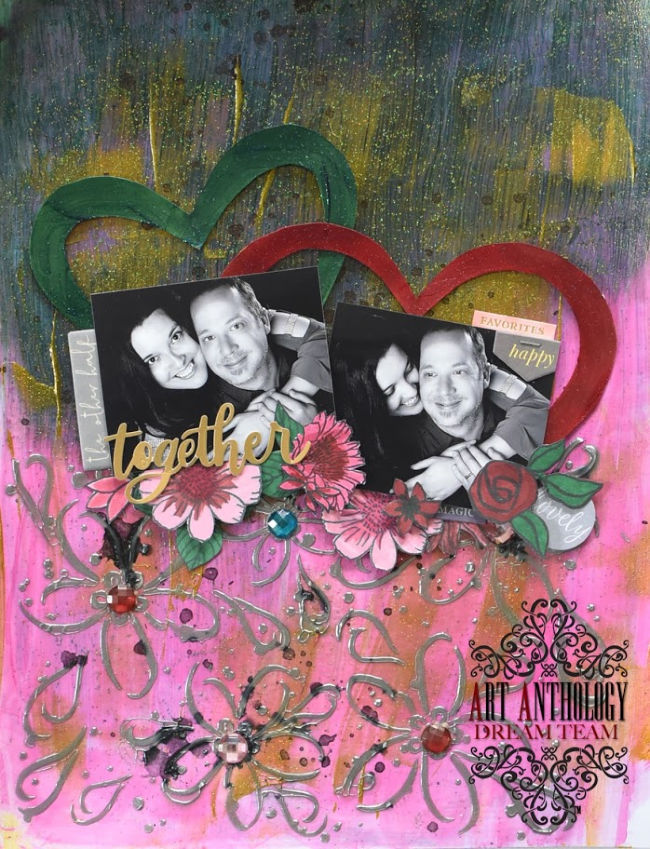 Since I only had clear jewels I used my markers to color them! They look perfect! Then I cut two hearts free-handed from cardstock and painted them to use as frames for the layout.