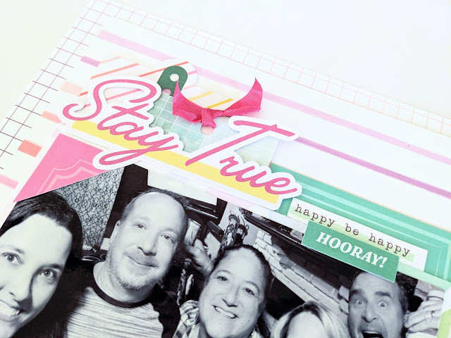 I really like the cubed patterned paper! It's super fun. I cut part of it to add a border at the bottom of the layout. There are lots of fun embellishments in this collection. I played with a variety of stickers! Normally, I reach for my die cuts, but not this time. I just wanted to use all the fun stickers!