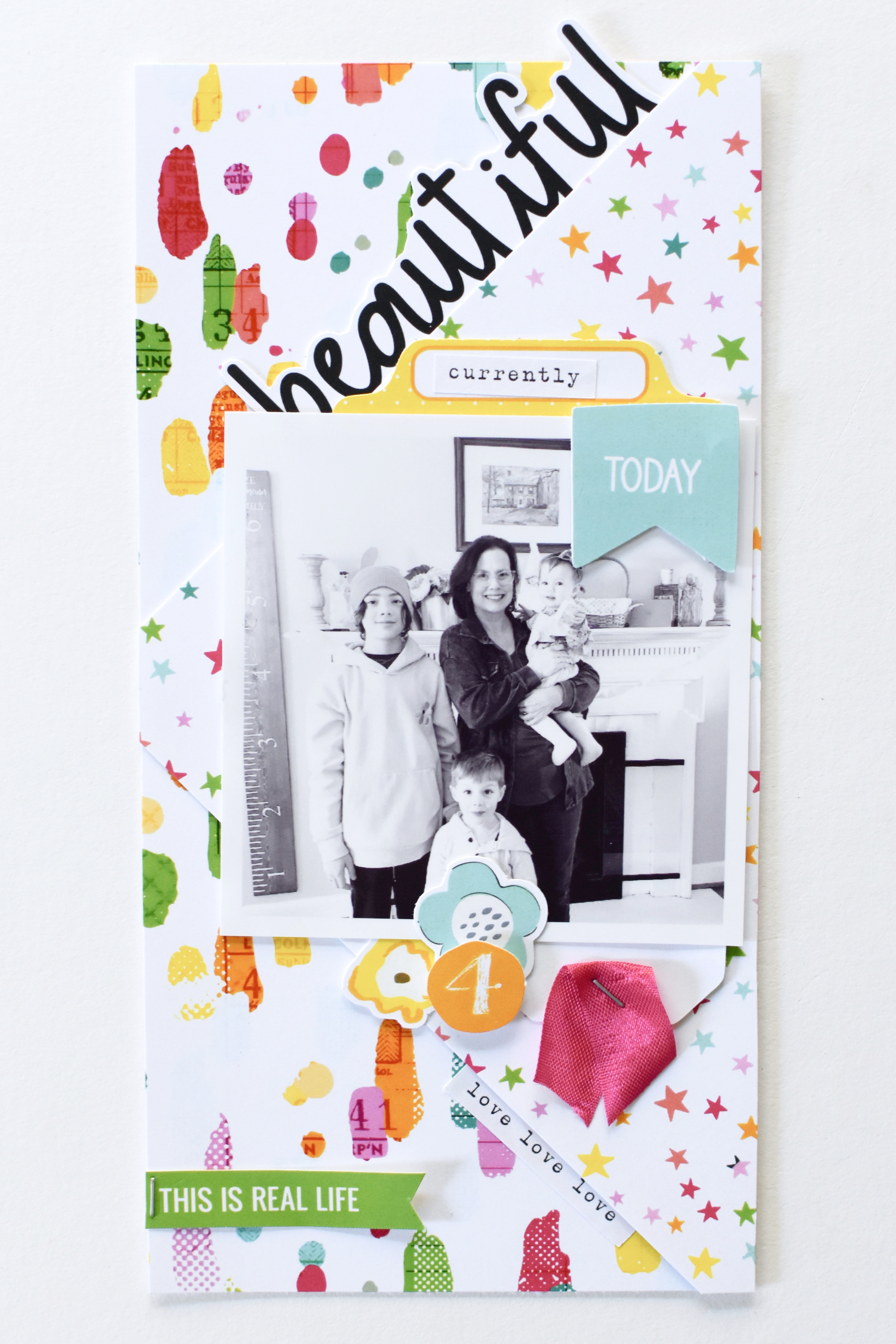 I layered a few papers together to add depth to the layout and tucked in a few flowers and stickers here and there.