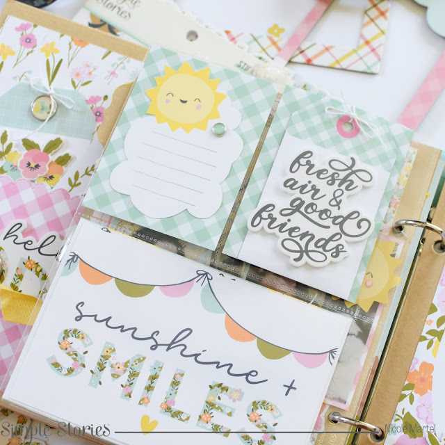 I used a few sheets of patterned paper from the 6x8 Fresh Air Paper Pad to cover the inside of the book. Next, I cut some tags from the cut-apart sheet and embellished them with a few decorative brads and ribbon/string. I mounted the “hello today” foam sticker onto the pocket and added the decorative brad and sun die cut! Isn’t this fun!?